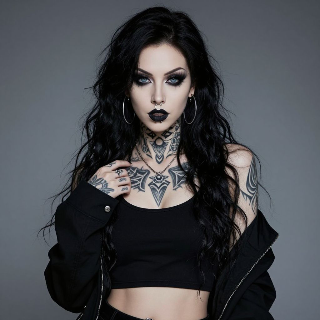 Photograph of a gothic-style woman with long, black, wavy hair. She has piercing blue eyes, heavy black eyeliner, and wears large hoop earrings, a septum ring, and multiple tattoos covering her neck and shoulders. She's dressed in a black crop top and an open black jacket, with her left hand touching her collarbone. The background is a simple, gradient gray.