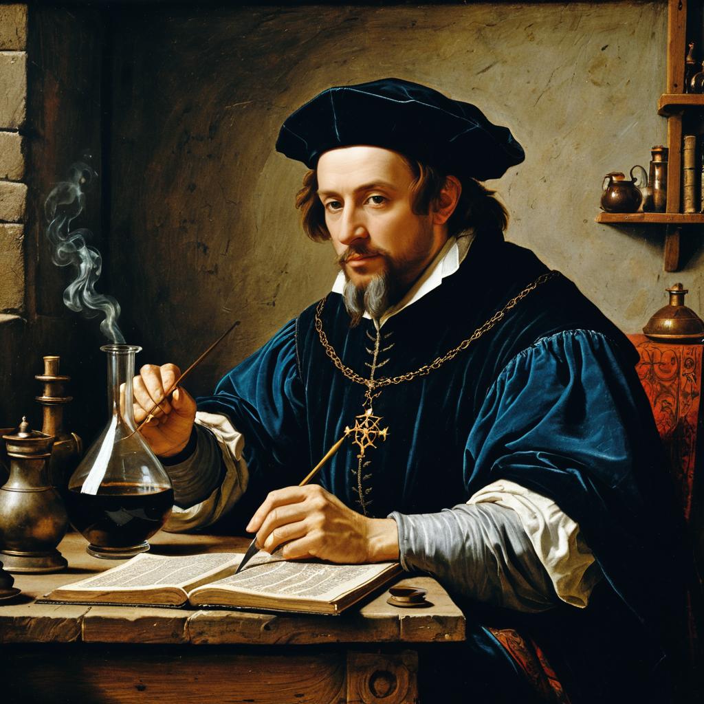 A Renaissance painting of medieval alchemist from 1510, with classical style, detailed realism.