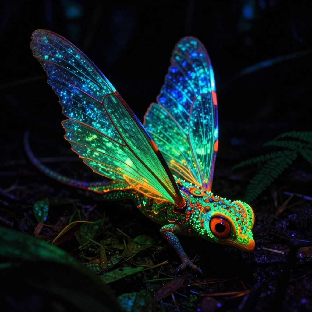 Photograph of a bioluminescent dragonfly-like insect with vivid, glowing wings. The wings are iridescent, displaying vibrant shades of blue, green, and purple with sparkling, star-like dots. The insect's body is adorned with bright, multicolored patterns, including orange, green, and blue. Its large, red eyes stand out against the dark, blurred background of forest floor elements. The insect is positioned slightly to the right, with its wings spread open. The image is highly detailed and illuminated, highlighting the insect's luminescent features against the dark surroundings.