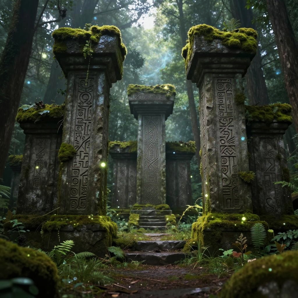 Bгјrowand in a mystical forest setting, ancient ruins covered in glowing moss, soft ambient lighting, intricate runes carved into stone pillars, fantasy atmosphere with floating ethereal particles and a serene mist enveloping the scene