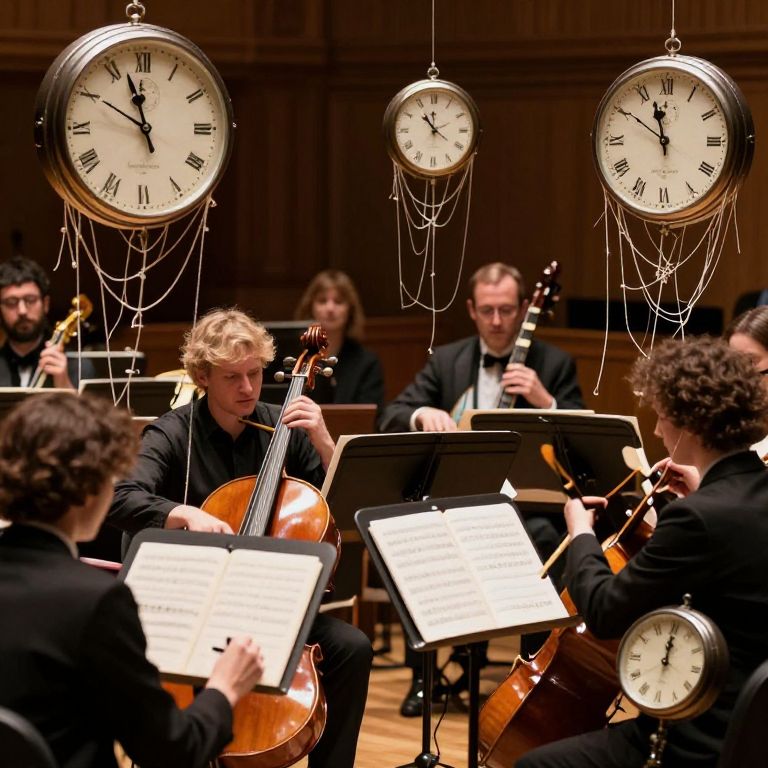 An orchestra of melted clocks plays with bows crafted from strands of forgotten time, composing symphonies that rewind or fast-forward anyone who hears them.