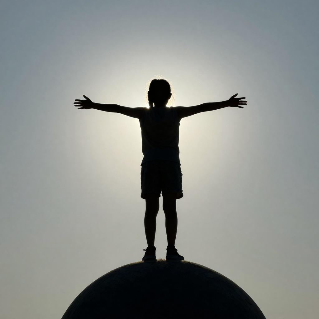 Black and white photograph of a silhouetted figure with arms outstretched, standing in a tunnel filled with glowing, rectangular lights. The figure's stance is powerful, casting a shadow over the ground. The tunnel's lights create a dramatic, illuminated backdrop.