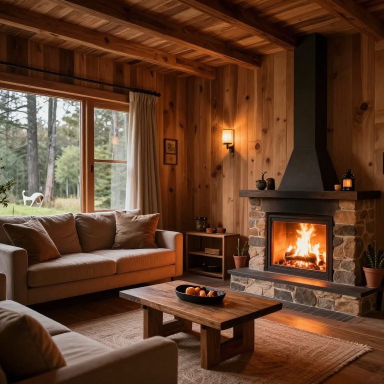 A warm and inviting living room interior of a wooden cabin featuring a stone fireplace with a burning fire, beige sofas with cushions, wooden coffee table with a bowl of fruit, large window with beige curtains overlooking a forested outdoor area, and soft ambient lighting.