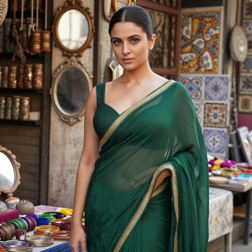 A stunningly elegant woman with olive skin, soft amber eyes, and straight dark hair tied in a neat bun wearing a luxurious deep emerald green fancy saree costume, posing in front of a vintage Indian market filled with bangles, mirrors, and hand-painted tiles.. The woman has big tits and cute face