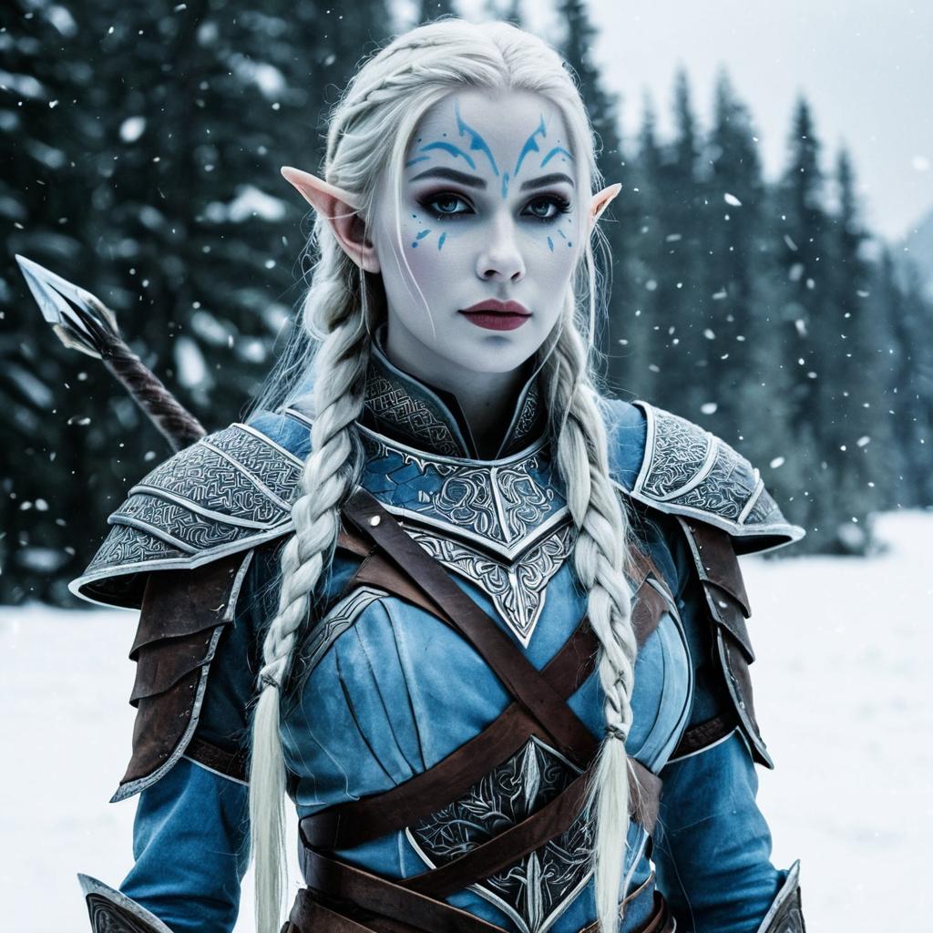 A solo elf woman with blue skin and long blonde braided hair stands in a snowy forest. She is dressed in detailed blue and silver armor with intricate designs, featuring brown leather straps and shoulder guards. Her face is marked with blue tribal-like paint, and she has pointed ears. Snowflakes fall gently around her, creating a mystical winter atmosphere.