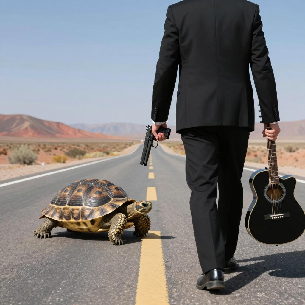 A man in a black suit, white shirt, holding a black handgun in his right hand and a black guitar in his left hand. He walks on an empty road with a yellow line, towards a tortoise in the center of the road. Clear blue sky and red-brown hills in the background. The man's face is not visible. The tortoise is brown with a ured shell.