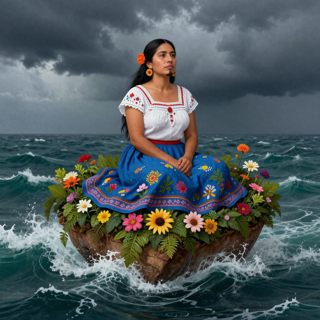 Photograph of a young Latina woman with long black hair adorned with an orange flower, standing on a floating rock covered in vibrant flowers and greenery. She wears a white, short-sleeved, embroidered blouse and a blue, ruffled skirt with colorful floral patterns. Her hands are gently clasped in front of her. The background features a stormy, dark grey sky and choppy ocean waves. The woman's expression is serene and contemplative, contrasting with the turbulent sea around her. The image combines elements of surrealism and realism, highlighting her cultural attire and the natural beauty amidst a stormy seascape.