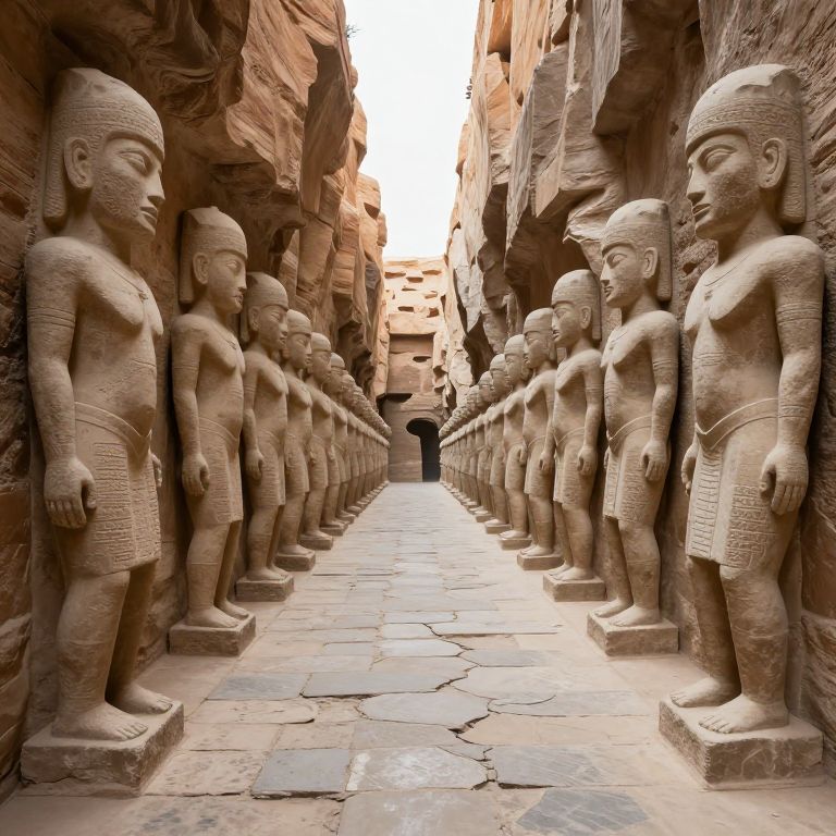 A sunlit canyon path is flanked by rows of enigmatic, humanoid stone figures standing in perfect symmetry, their forms defying gravity as they appear to float above a cracked, ancient stone floor, creating a surreal tableau where history and imagination converge.