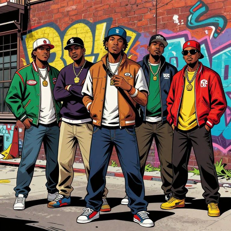 Photograph-style digital illustration of five Black men in streetwear standing against a graffiti-covered brick wall, each wearing baseball caps and gold chains. Bright,