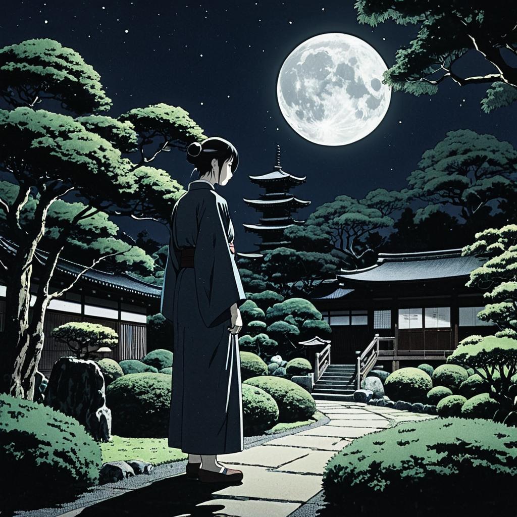 An old calligrapher, wearing traditional silk robe, sitting in a quiet temple garden, surrounded by ink brushes and falling cherry blossoms, illustrated in the nostalgic and atmospheric manga style of Tadao Tsuge.