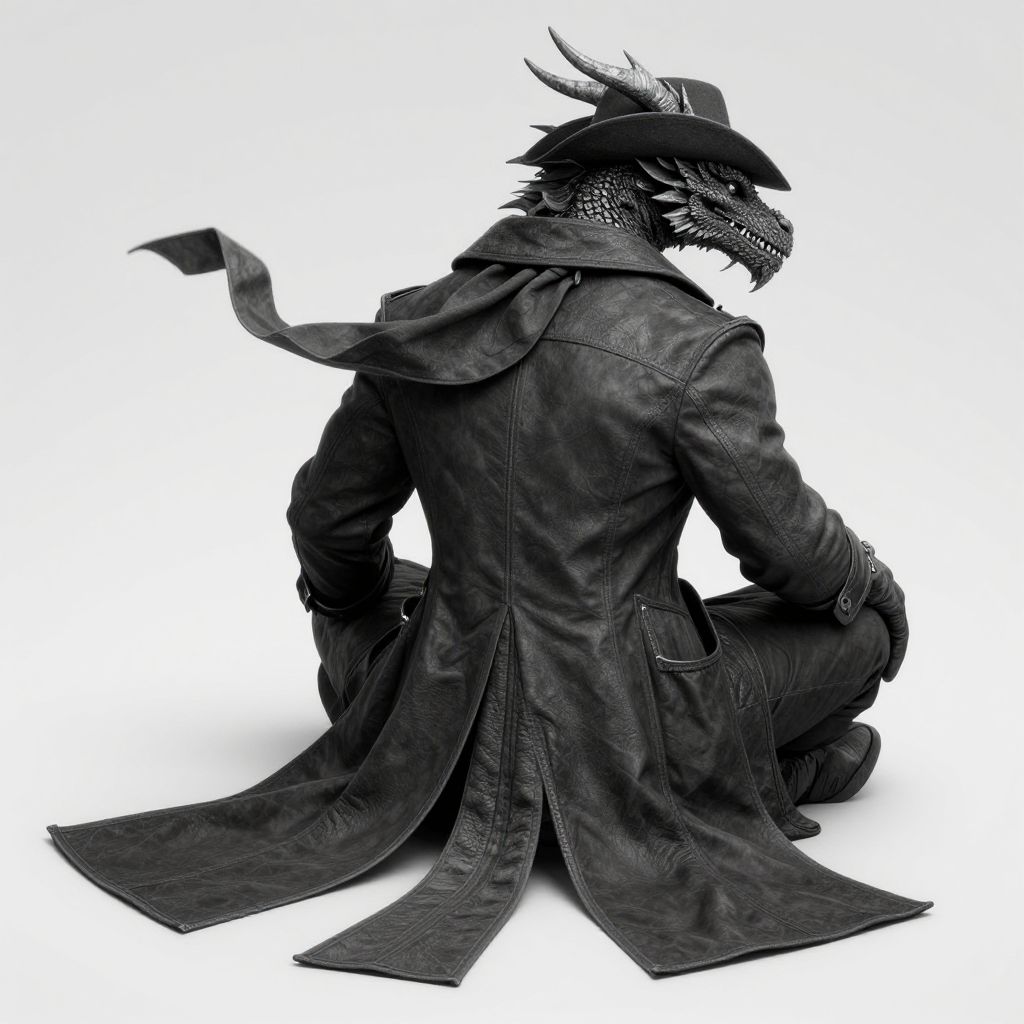 Male, soro, Anthro, demihuman, muscular, dragon, western dragon, Eastern dragon, dragon skin, tow horn, clothed, clothing, ((cowboy wear, neckerchief, fluttering neckerchief.swaying neckerchief, coat, coat hem, stretched coat, Draw neatly all the way to the hem, cowboy hat, gloves, cowboy boots)) realistic hands, 8k hd, extreme detail, extremely detailed, 2d clear, simple background, Full body image, High resolution, Binarization, back view, squat, Droopy hem. hem hanging down to the ground, hem on the ground, Wrinkles, Wrinkled hem. long hem, elongated hem, lengthen the hem, sit down, touch one's butt to the ground, cross-legged, sitting cross-legged, looking up, wariza