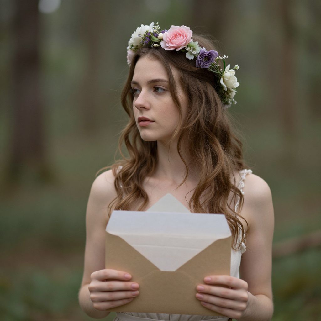 Photograph of a young Caucasian woman with long, wavy brown hair wearing a floral crown with pink and white roses and purple flowers. She has fair skin and is dressed in a sleeveless, white lace top. She holds a brown envelope with a white letter inside, her hands gently gripping the envelope. The background is a softly blurred forest with tall trees and greenery, creating a serene, natural setting. Her expression is thoughtful and slightly melancholic, and the lighting is soft, adding a dreamy quality to the image.