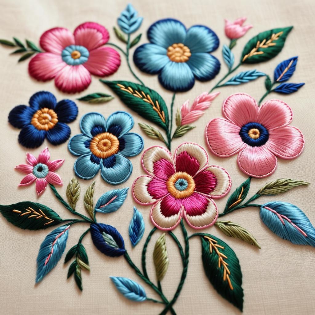 Close-up of intricate hand embroidery featuring detailed floral patterns with pink and blue flowers, rich textured threads on beige fabric background, folk art style embroidery, bright and warm colors mixed with cool blue tones, natural lighting highlighting thread texture