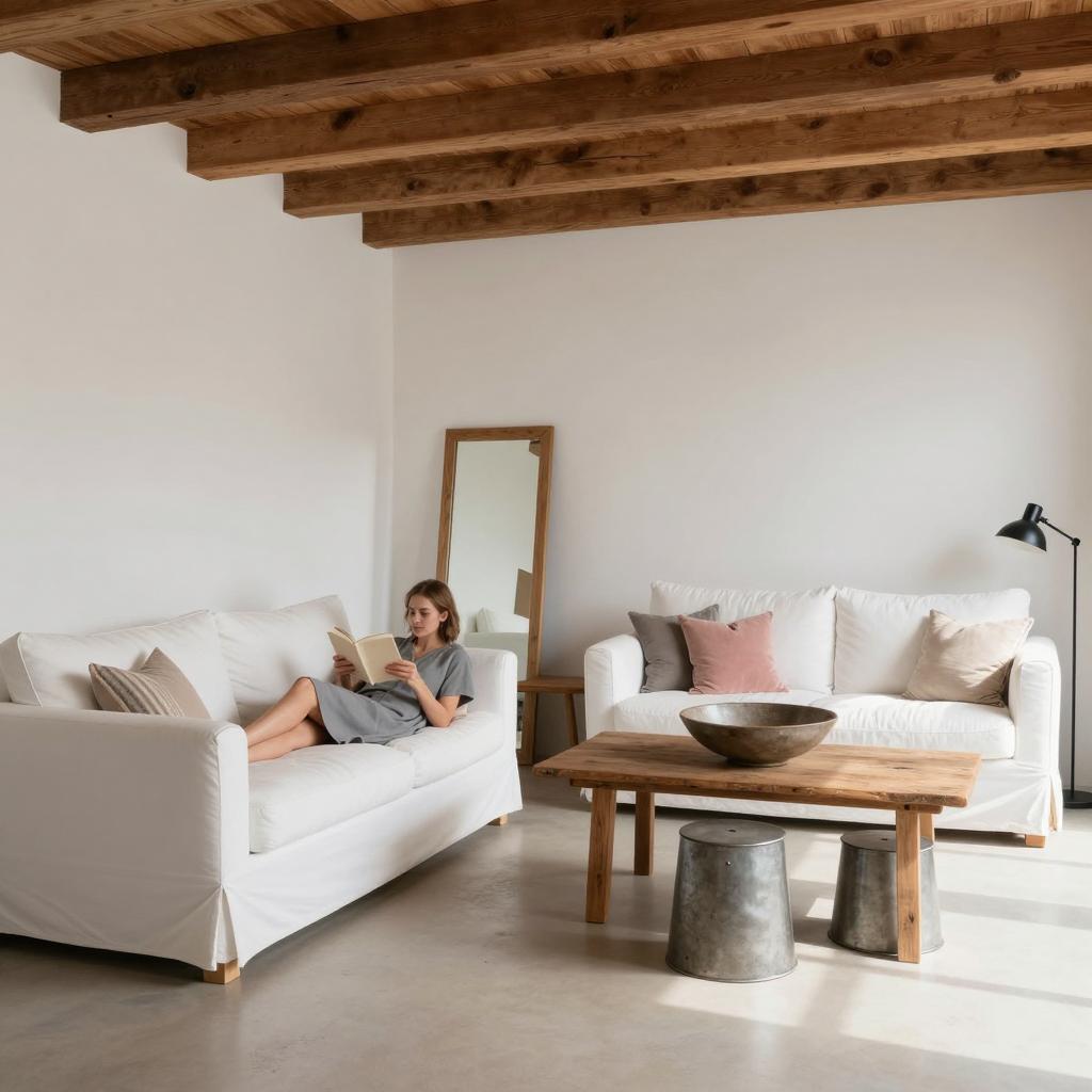 Photograph of a minimalist, sunlit room. Two white couches with gray, pink, and striped pillows. Wooden ceiling beams, white walls. A woman with light skin, wearing a gray dress, lies on the left couch, reading a book. Wooden mirror leaning against the wall. Rustic wooden table with a large bowl, two cylindrical metal stools. Black table lamp on the right couch. Beige floor. Sunlight casting shadows on the floor.