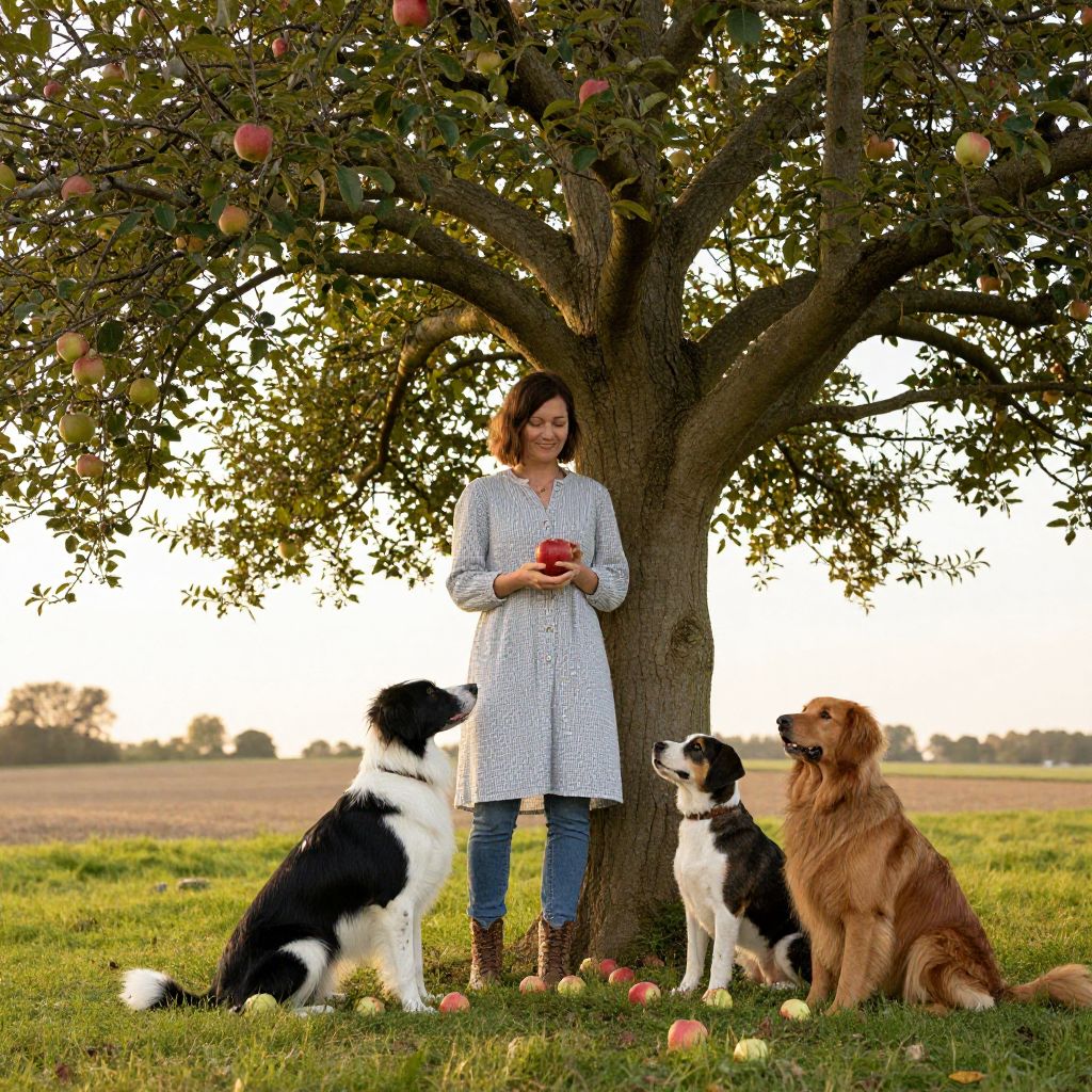 Woman stands beneath a sprawling apple tree, cradling a ripe red apple while two dogs sit attentively by her side, surrounded by fallen apples and a serene pastoral landscape under a soft, golden sky.