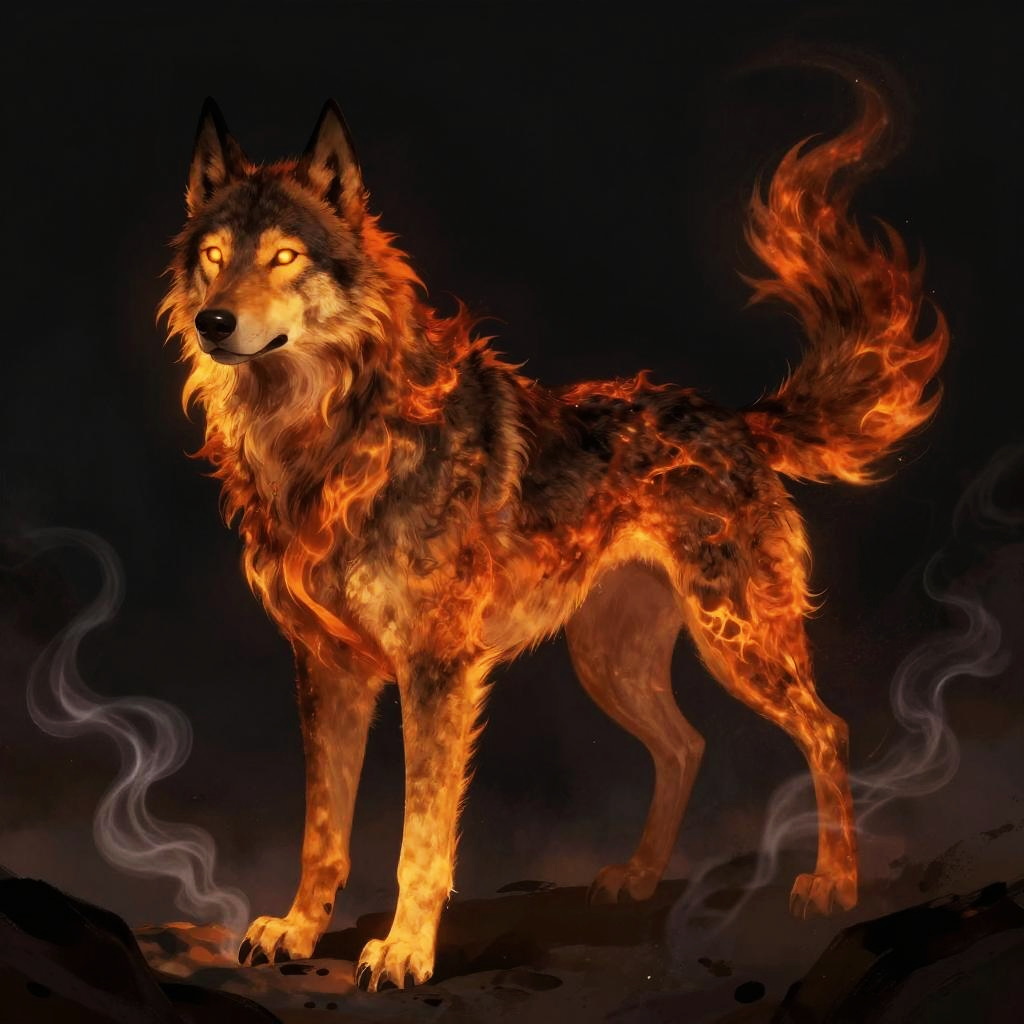 Illustration of hellhound art capturing a ghostly guardian of the underworld, with flame-like fur textures and wisps of smoke trailing from its tail, glowing eyes piercing through darkness, dramatic fantasy atmosphere.