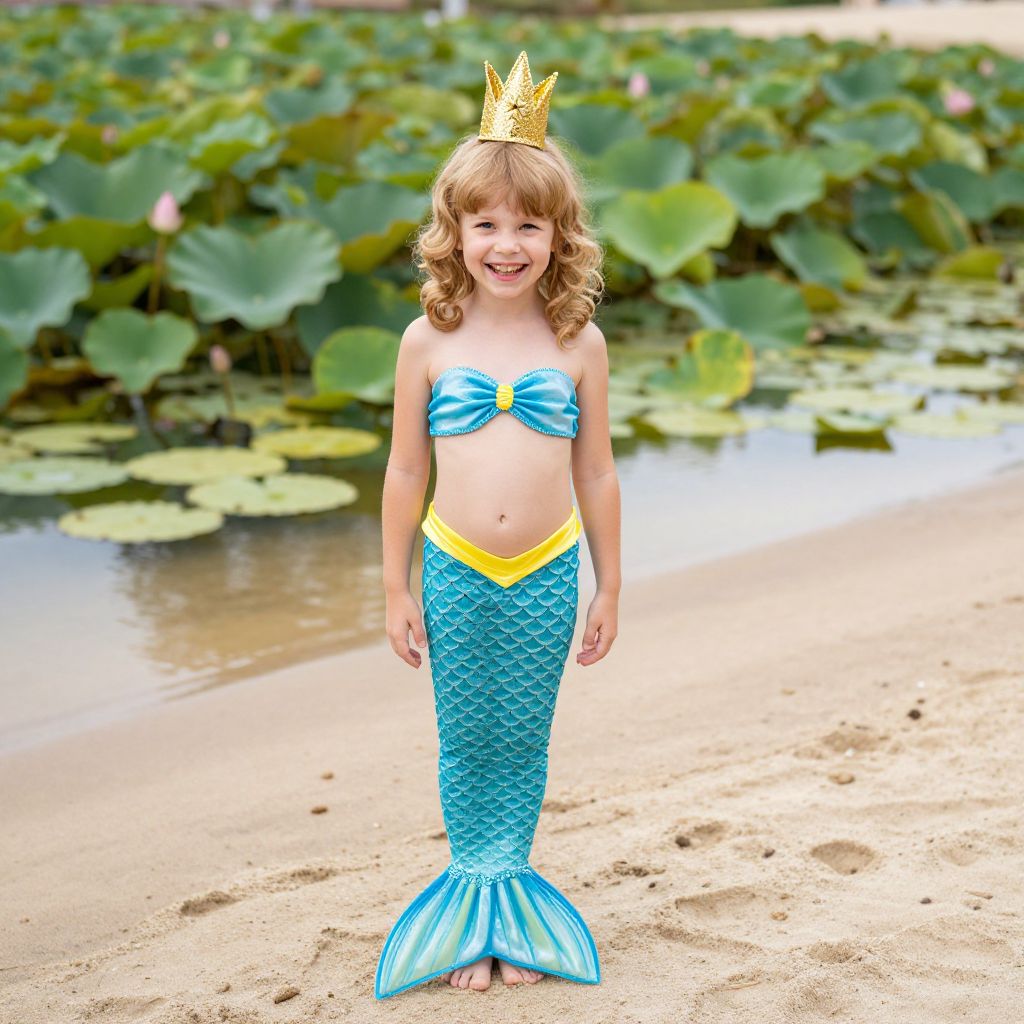 Photograph of a smiling, curly-haired young girl with a blue mermaid costume, yellow top, and golden crown, standing on a sandy beach with