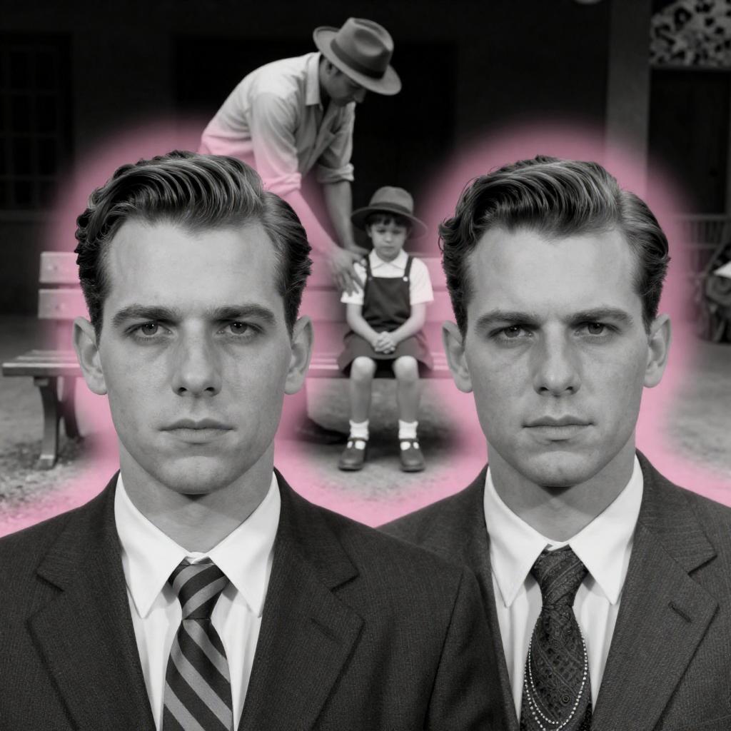 Black-and-white photograph with two large portraits of a man and woman in the foreground, both with slicked-back hair and serious expressions. Man wears a suit with a striped tie, woman in a dress with a necklace. Background features a black-and-white scene of a man helping a child sit on a wooden bench, both wearing hats. Pink glow surrounds the portraits, contrasting with dark background.