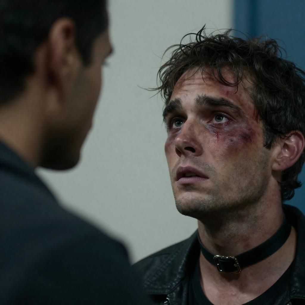 Photograph of a dimly lit room with a muscular man in a black shirt and white gloves standing over a bloodied, unconscious man lying on a table. The background includes wooden blinds, a lamp, and a door. The man on the table is dressed in dark clothing, with blood splattered around him.