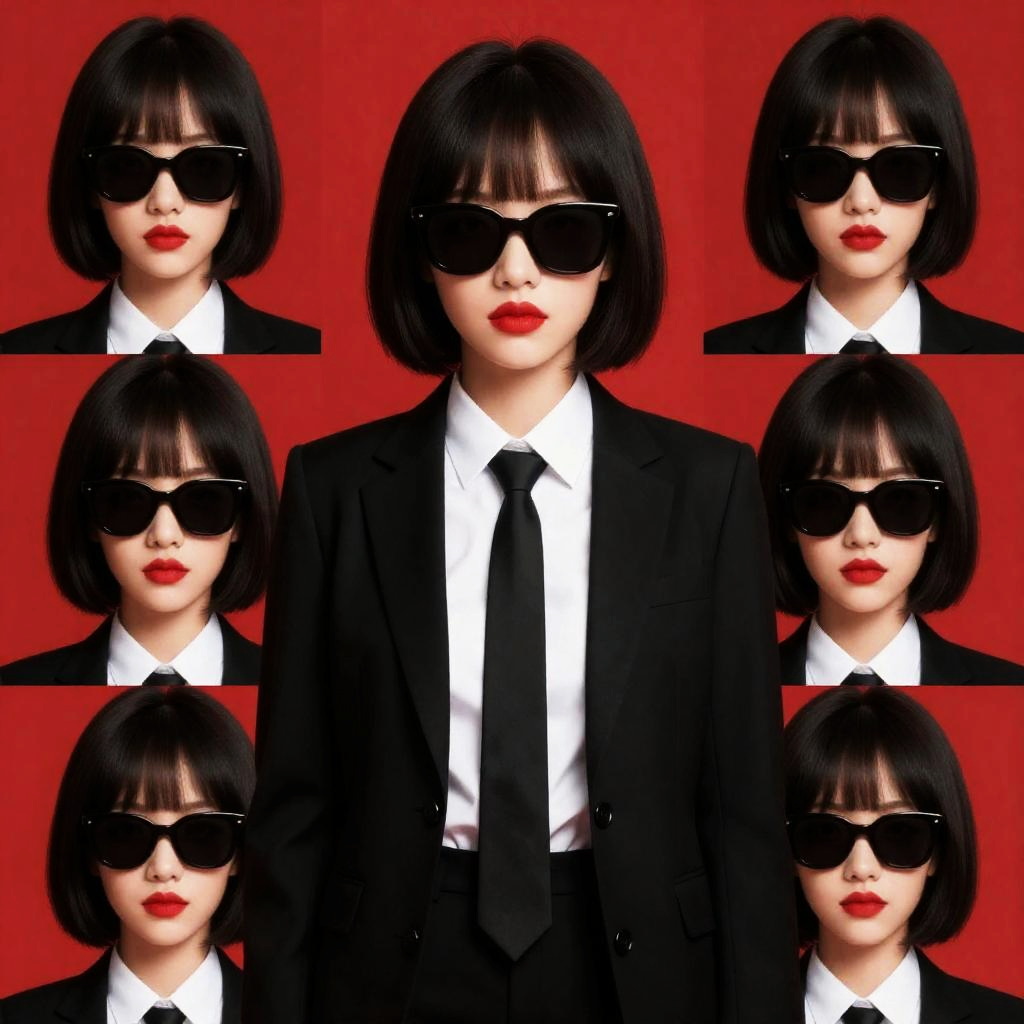 This digital artwork features a central female figure with black bobbed hair, wearing a black suit, white shirt, and black tie, paired with oversized black sunglasses. She stands against a bright red background filled with identical headshots of herself, each with matching black bobbed hair, red lips, and black sunglasses. The style is bold and graphic, with sharp contrasts and a pop art vibe.