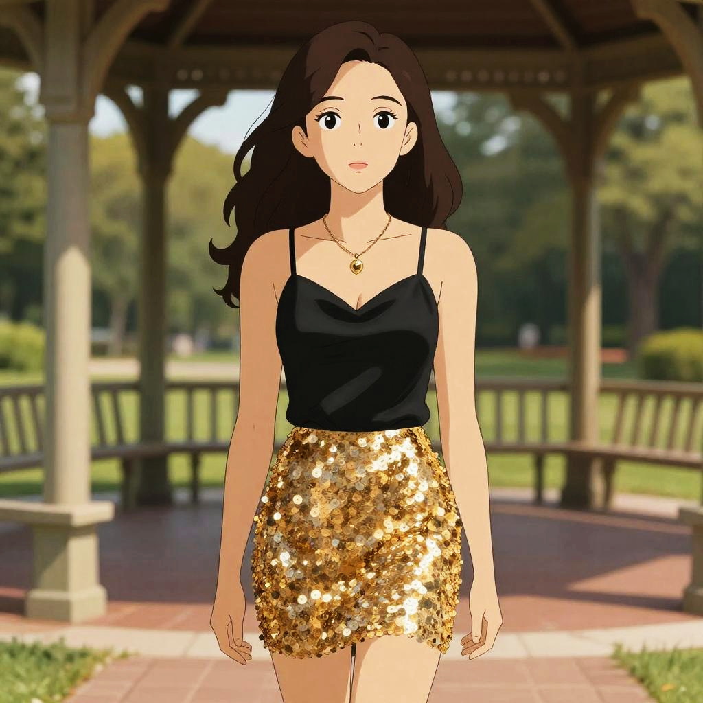 A lean woman in a contemporary chic black satin camisole and shimmering gold sequin A-line mini skirt stands under a gazebo on a university campus, her natural wavy hair cascading down as she wears a delicate gold pendant necklace, all illustrated in a whimsical Studio Ghibli style. Sexy. Pretty face and beutiful eyes