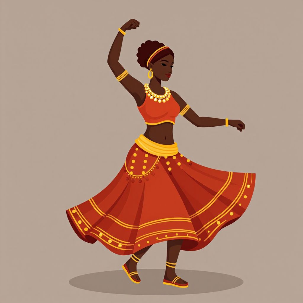 Digital illustration of a dark-skinned African woman dancing in a red traditional outfit with yellow accents, adorned with jewelry, against a beige background.