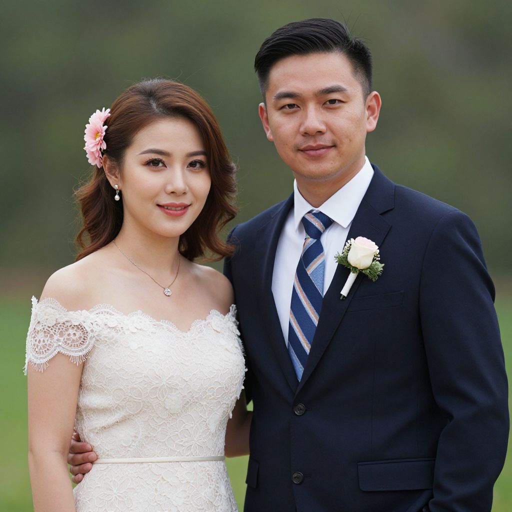 Photograph of a smiling Asian couple on their wedding day; she wears a white lace off-shoulder dress, he in a black suit with a