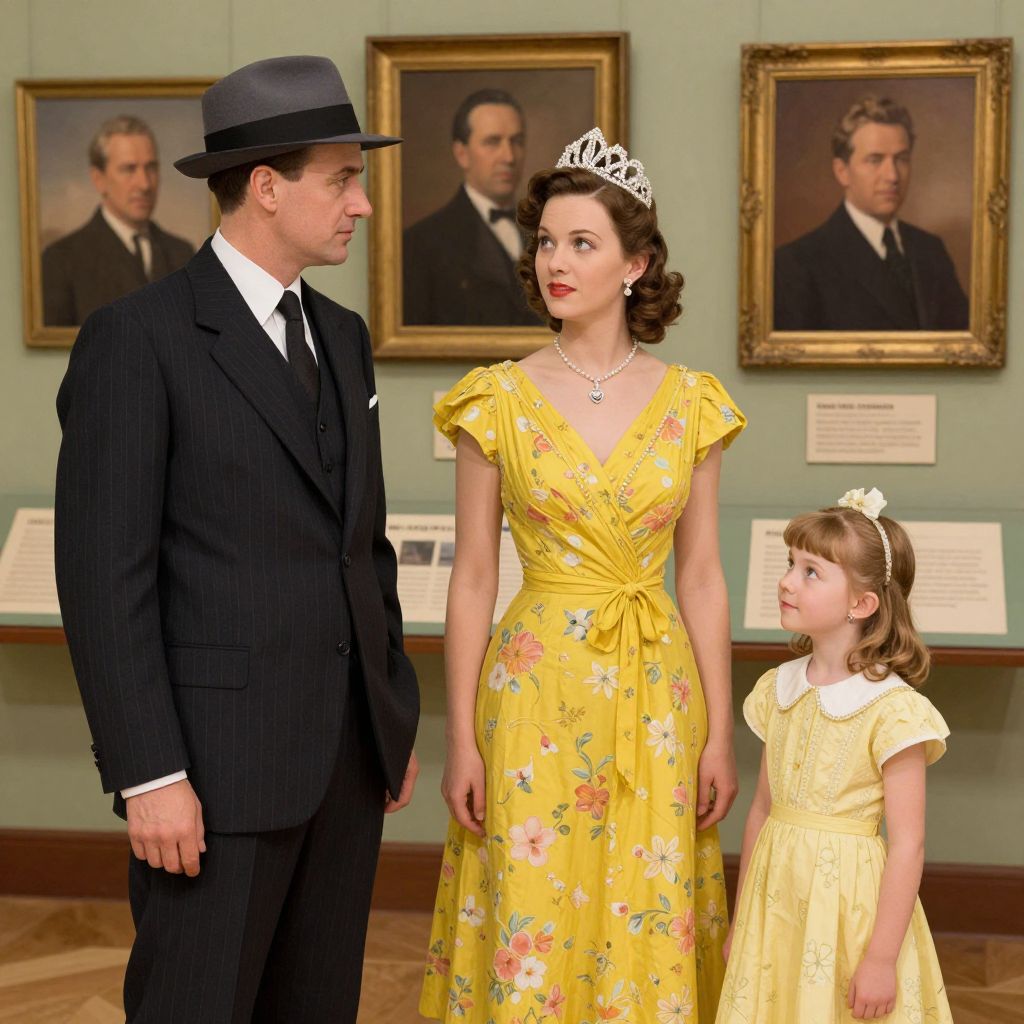 A digitally rendered illustration depicts a vintage scene in a museum, featuring a man in a pinstripe suit and fedora, a woman in a yellow floral gown adorned with a tiara, and a young girl in a matching dress, all set against a backdrop of framed portraits and informational plaques, evoking a retro, classic style reminiscent of mid-20th-century elegance.