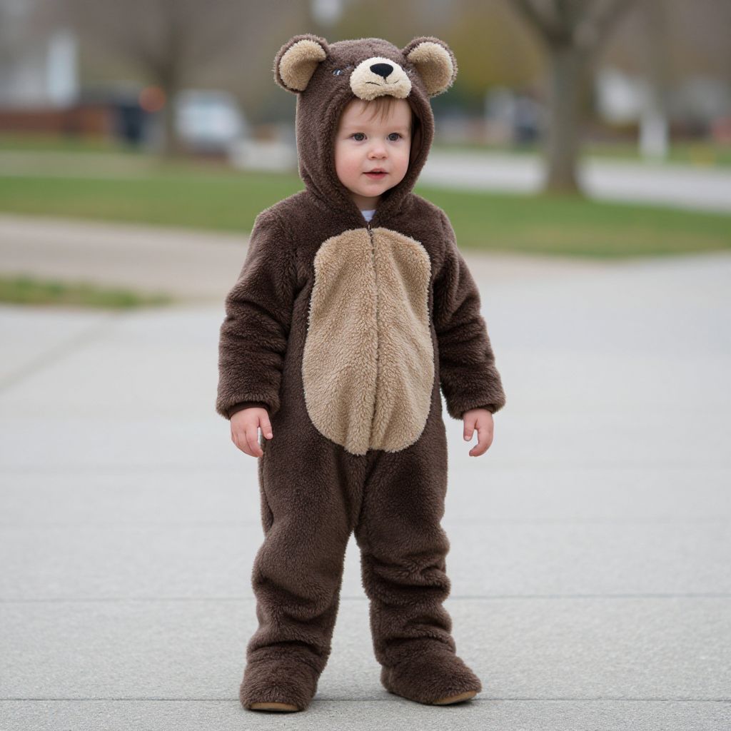 Photograph of a fair-skinned toddler in a brown bear onesie with a beige belly, standing on a suburban sidewalk.