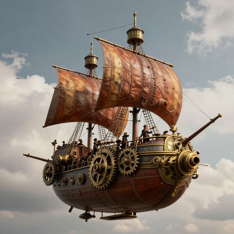 Grooed whimsical steampunk airship soaring through cloudy skies, intricate brass gears and leather sails gleaming in soft sunlight, crew of fantastical characters preparing for adventure, detailed machinery with a vintage fantasy flair.