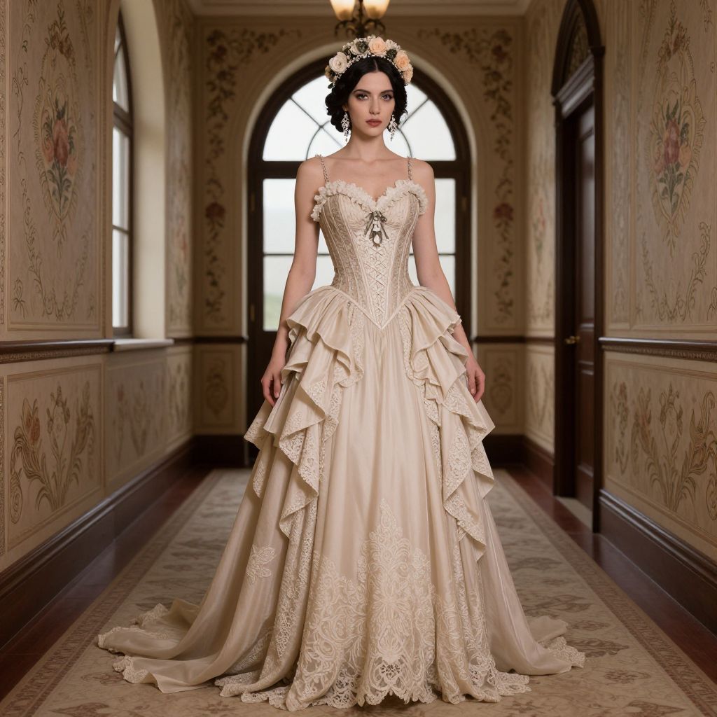 Elegant gothic-inspired gown featuring a corseted bodice with intricate lace detailing, layered ruffles, and a flowing skirt, worn by a woman adorned with a floral headpiece and dangling earrings, set against the backdrop of a grand hallway with ornate floral wallpaper and arched windows.