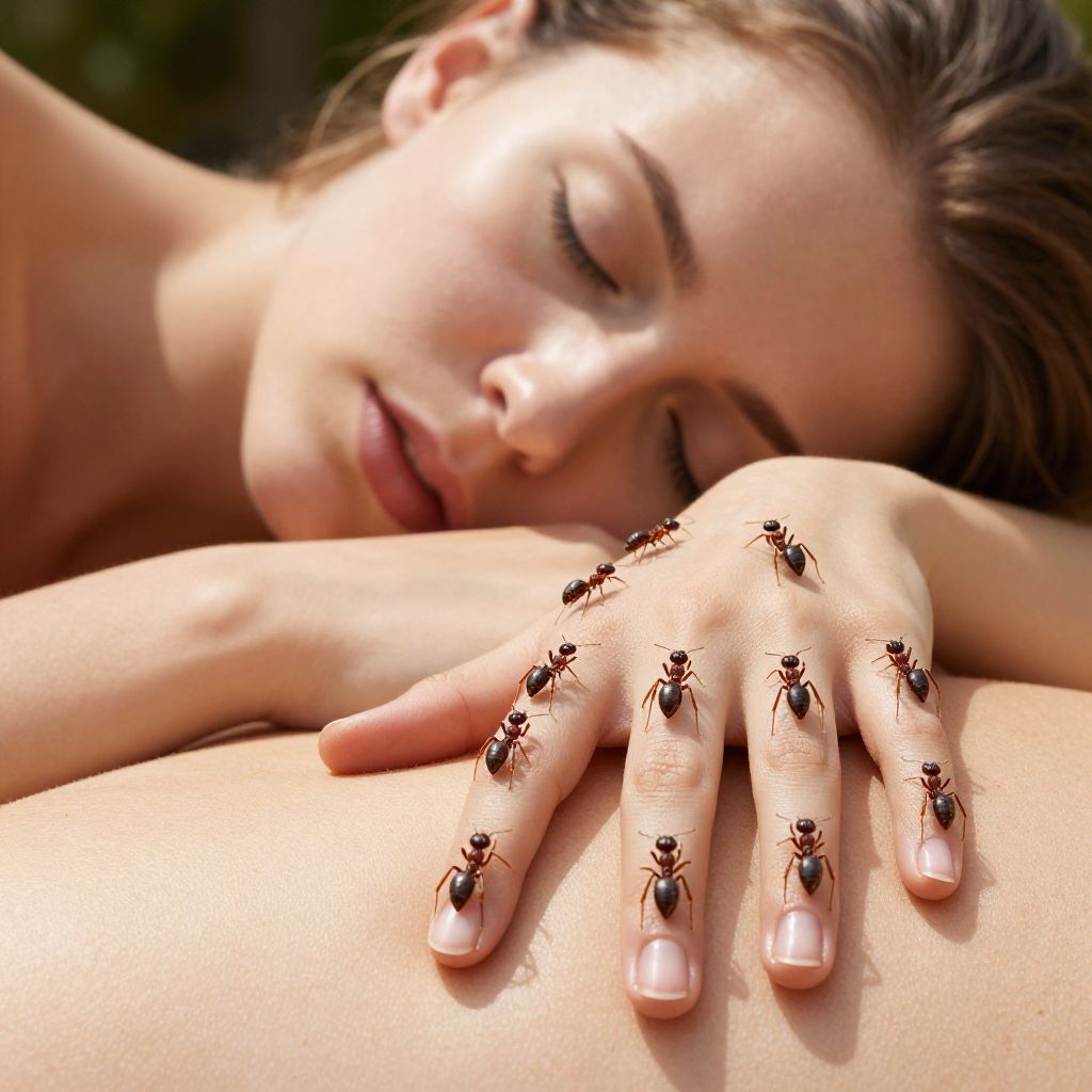 Ants crawl in intricate geometric formations across the smooth, sunlit skin of a peacefully sleeping woman, whose closed eyes and serene expression suggest she is dreaming of constructing miniature worlds on her outstretched fingertips.