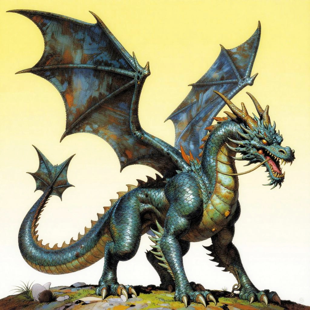 Fantasy illustration of dragon by Moebius, Syd Mead, high detail, pop art influences.