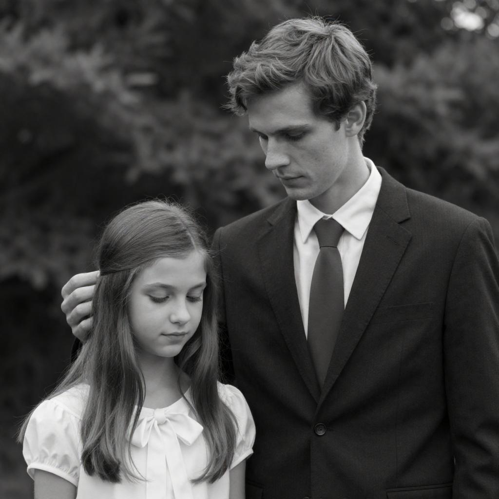 Sepia-toned photo showing a young girl with braided hair wearing a light-colored dress, sitting next to a man in a white shirt, cap, and sunglasses. Both are seated on a bus with seatbacks and window visible in the background. The girl has a serious expression while the man looks downward.