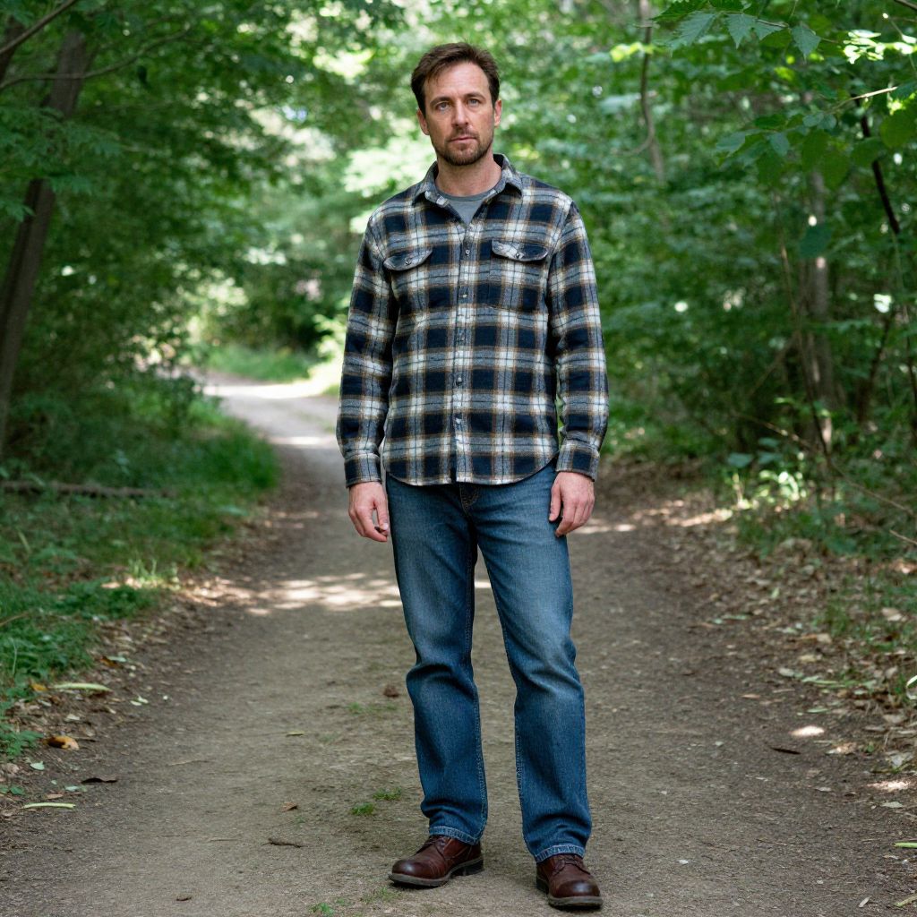 Photograph of a bearded man with short brown hair, wearing a black-and-white plaid shirt, blue jeans, and brown shoes, standing on