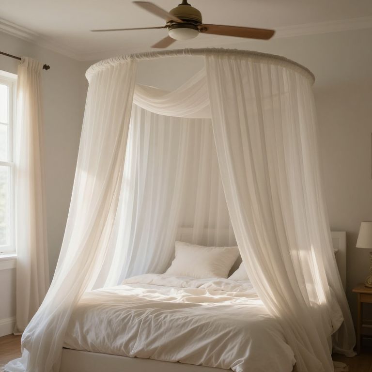 Enveloped in ethereal light and soft whispers of fabric, this romantic canopy bed invites dreams of serenity and timeless escape, where the gentle hum of the ceiling fan lulls the soul into a peaceful embrace.