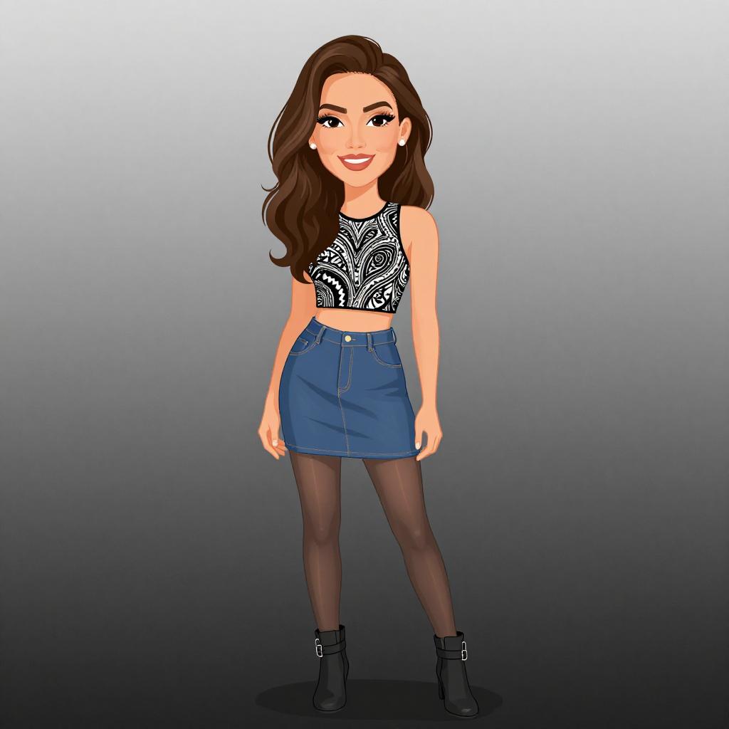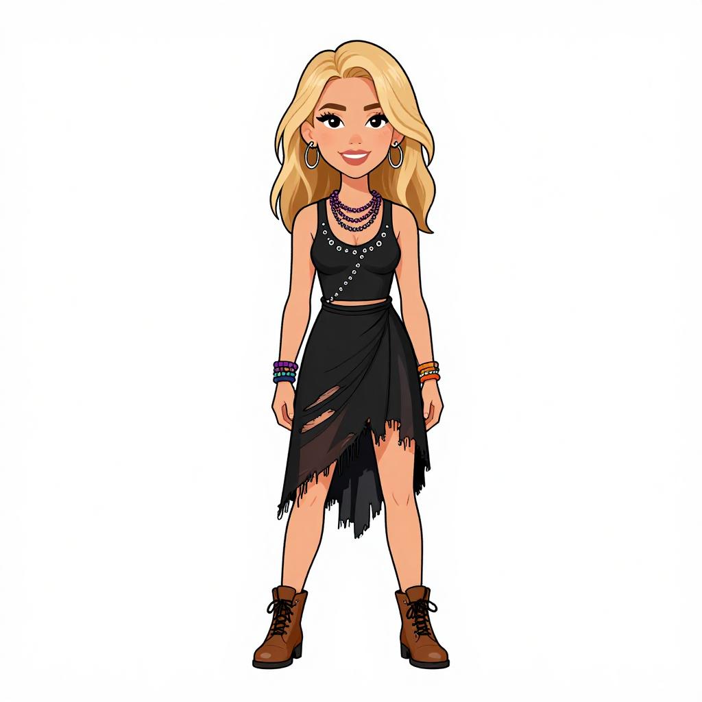 Cartoon blonde woman with long hair, black fringe dress, brown boots, multiple bracelets, and earrings, standing confidently against a white background.