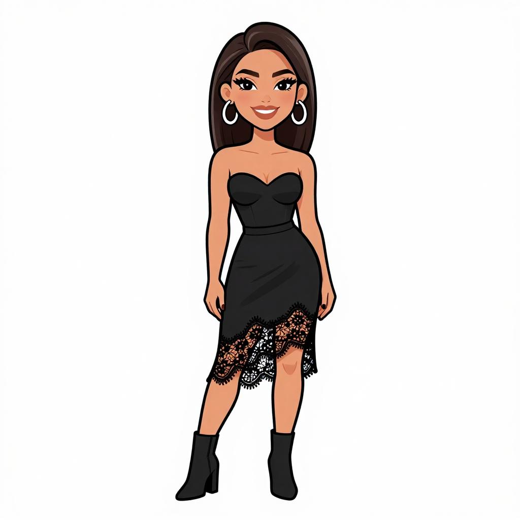 This is a digital drawing of a blonde woman with wavy hair, wearing a black, sleeveless, asymmetrical dress with fringe details. She has large hoop earrings, a layered necklace, and multiple bracelets on her right wrist. Her makeup includes dark eyeliner and red lipstick. She stands confidently with a slight smile, wearing brown ankle boots with laces. The background is plain white, making the character the sole focus. The art style is cartoonish with bold lines and bright colors, emphasizing her stylish, edgy look.