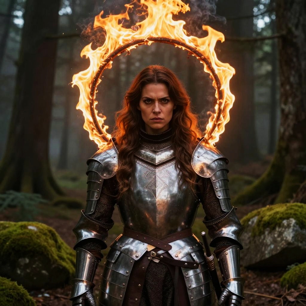 Photograph of a stern-faced woman with long, wavy brown hair, clad in shiny, silver medieval armor. She stands in a dense, misty forest with tall trees and moss-covered rocks. A vivid, circular ring of fire encircles her head, casting an intense glow on her determined expression. The forest background is dim and shadowy, contrasting with the bright flames and metallic armor. The image has a fantasy, dramatic, and mystical atmosphere. The woman's armor is detailed with visible rivets and a textured pattern.