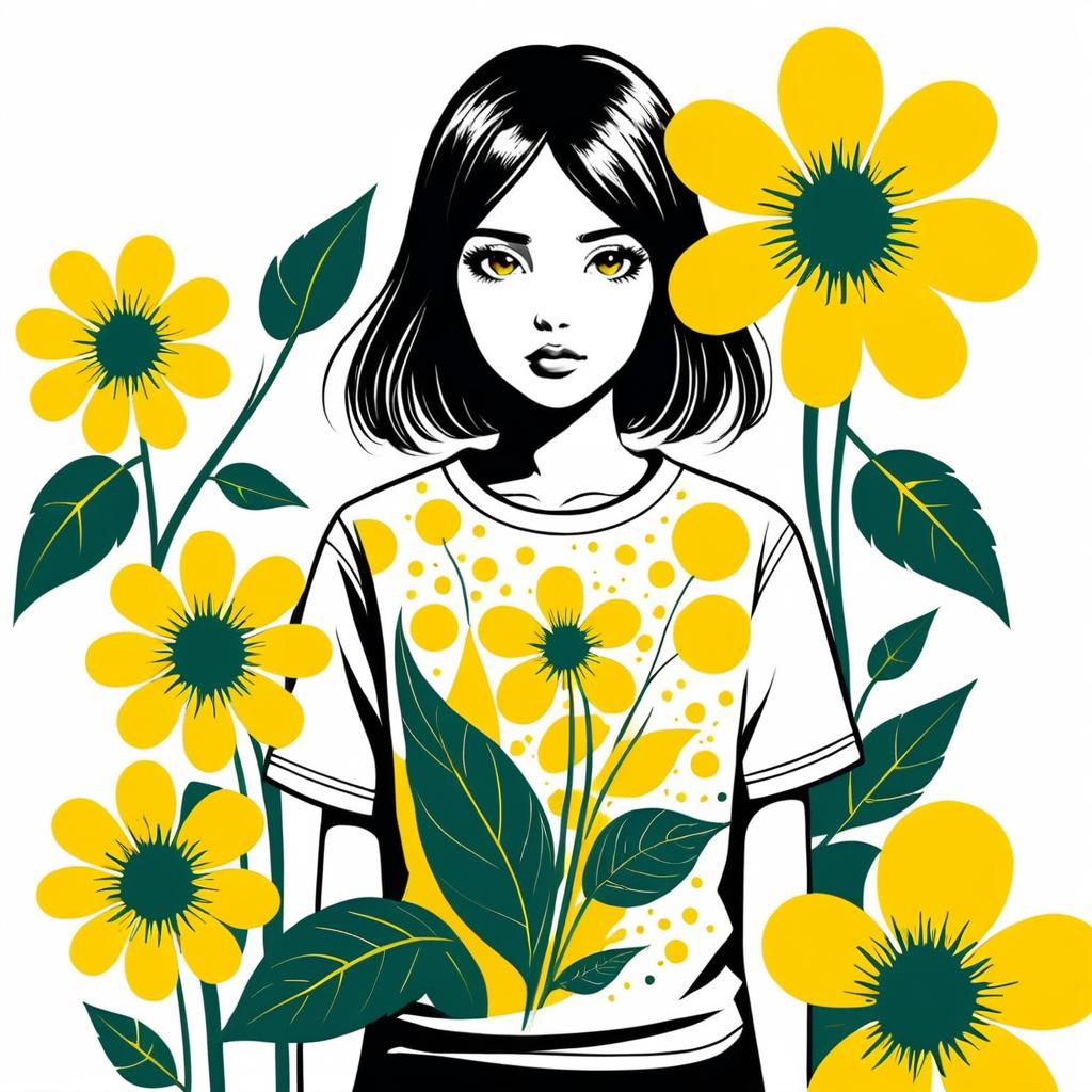 Flower, abstract, solo, leaf, no humans, yellow flower, 1girl, spot color, limited palette, shirt, surreal