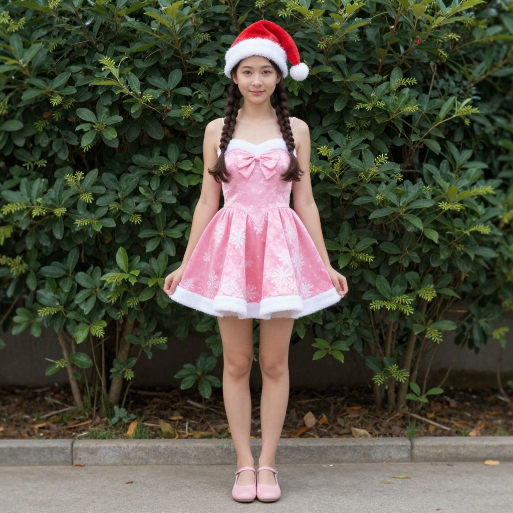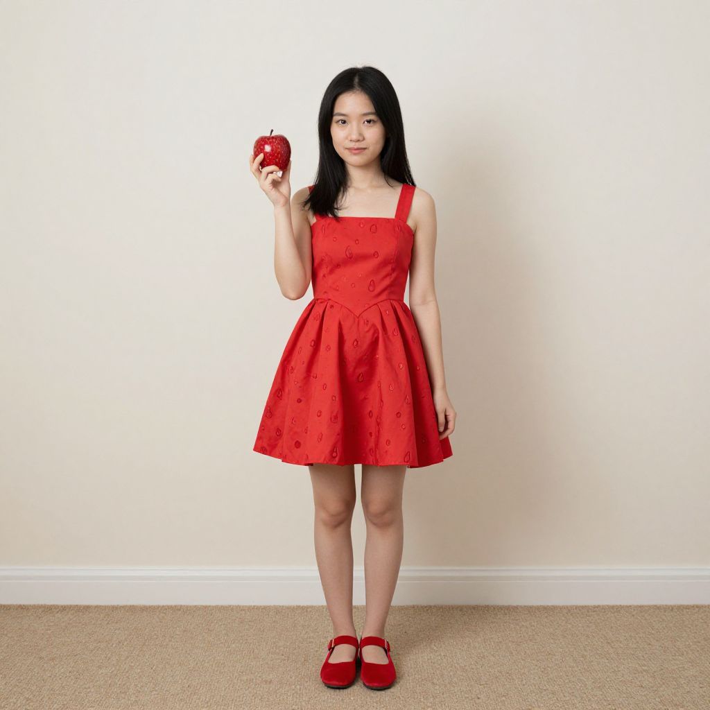 Carters strawberry costume, 1girl, solo, realistic, food, dress, fruit, red dress, full body, red footwear, standing, black hair, parody, apple