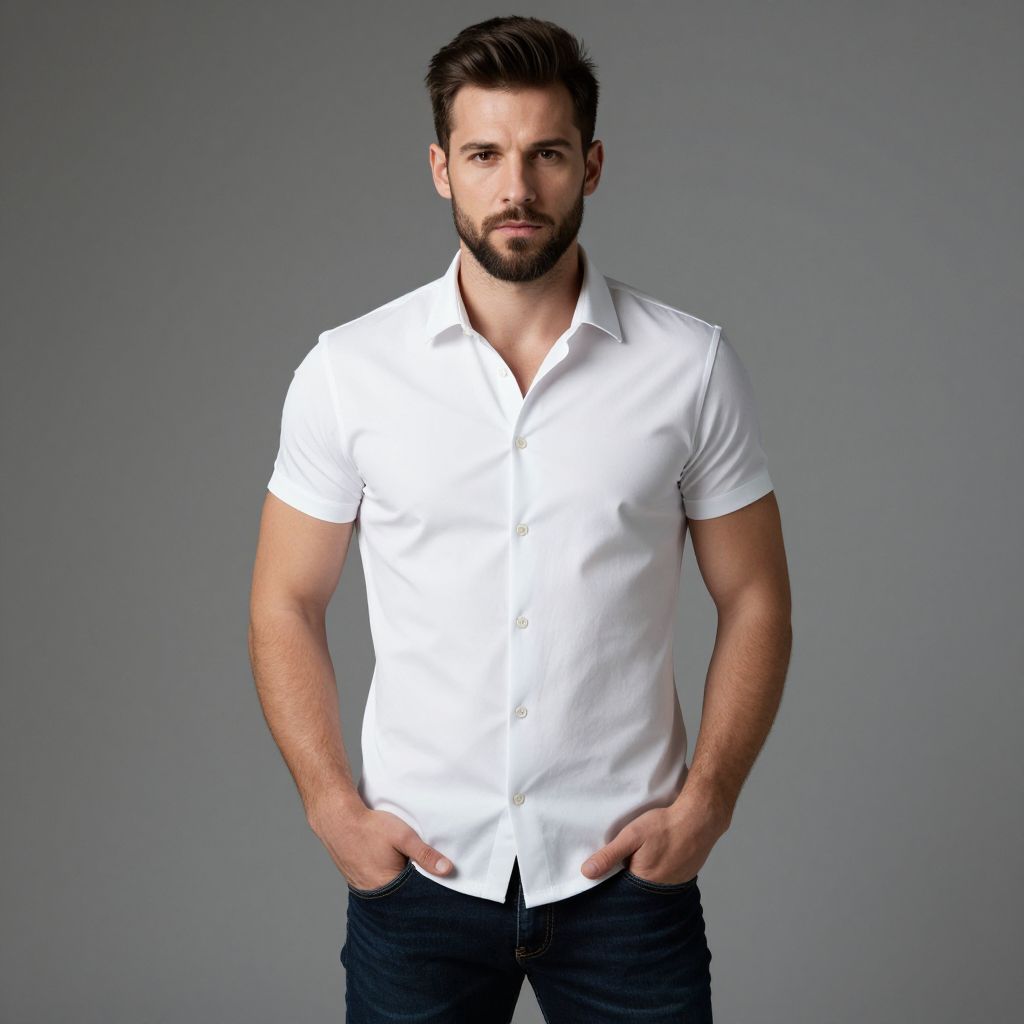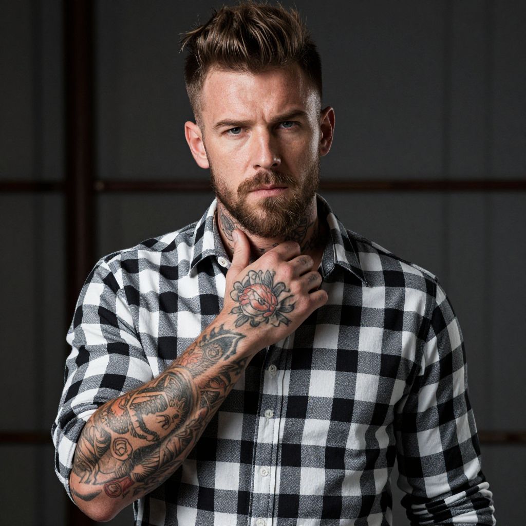 Photograph of a handsome, tattooed man with short, styled brown hair and a trimmed beard. He's wearing a black-and-white checkered shirt, buttoned up, and has his right hand touching his neck, showing off detailed arm tattoos. He has a serious, slightly intense expression and is standing against a dark, industrial background with soft lighting highlighting his face and tattoos.