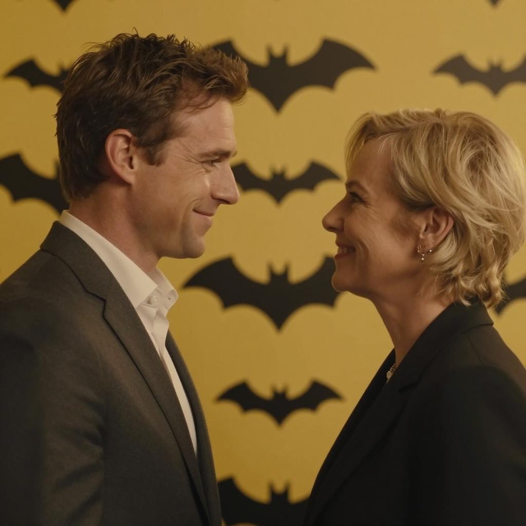 Photograph of a man and woman facing each other, smiling slightly. Man has short brown hair, wears a dark suit with a white shirt and tie. Woman has short blonde hair, wears large silver earrings. Background is yellow with black bat silhouettes. Both subjects are in profile view.