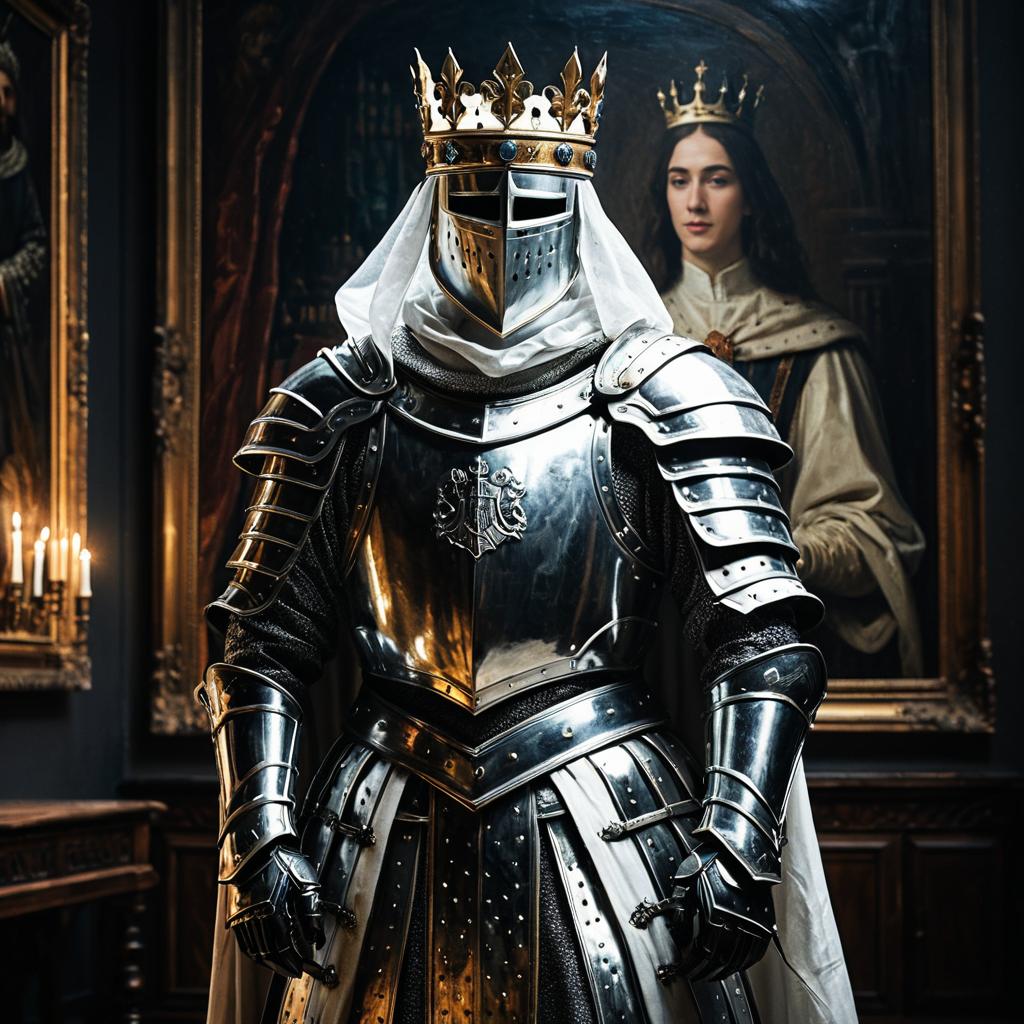 A medium shot of a figure dressed in shining medieval armor with a detailed crest on the chest plate, wearing a white cloth beneath and a golden crown on the helmet. The background features a blurred classical painting of a crowned noblewoman in royal attire, under warm soft lighting in a dark academia aesthetic setting. The composition evokes a royal, magical, and cinematic atmosphere.