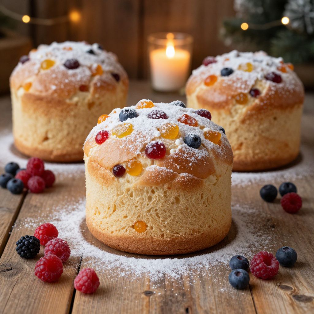 Panetones displayed elegantly on a rustic wooden table, surrounded by fresh berries, powdered sugar dusting, warm ambient lighting creating a cozy, festive atmosphere, rich textures highlighting the soft bread and candied fruits, holiday celebration vibes.