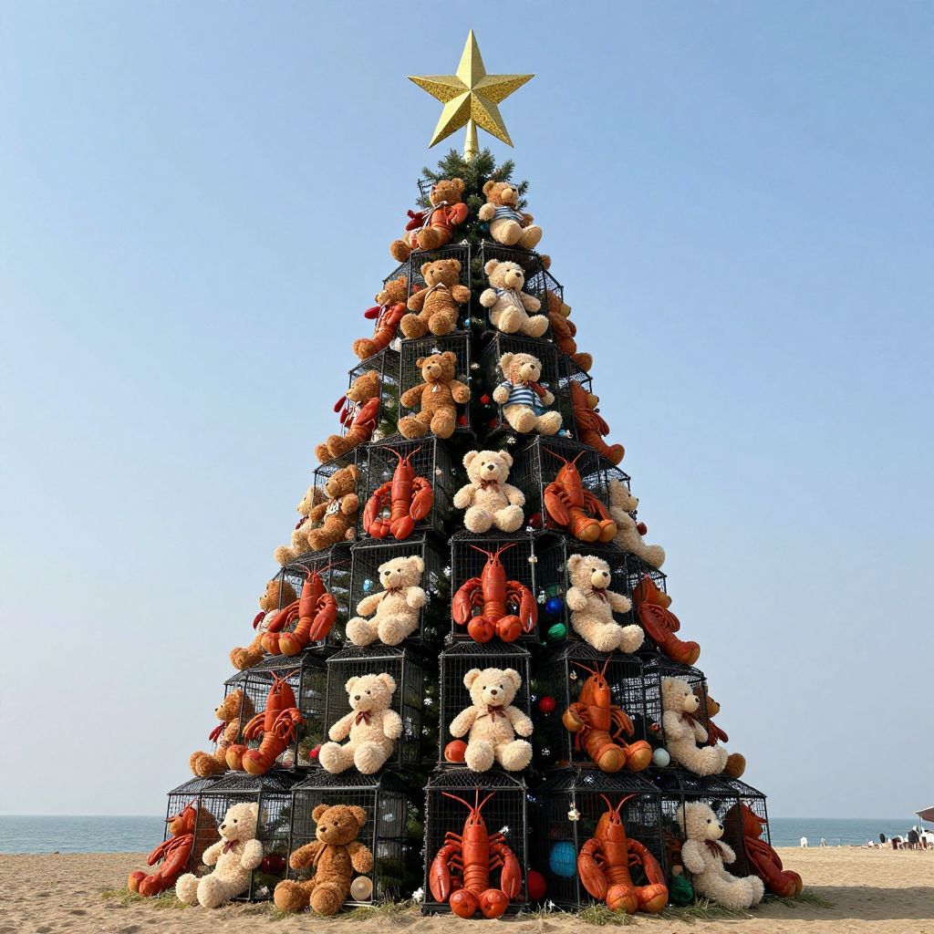 A towering Christmas tree emerges from the earth, composed entirely of stacked lobster cages brimming with an abundance of plush teddy bears, crowned with a radiant golden star, defying the boundaries between marine life, childhood nostalgia, and holiday magic.