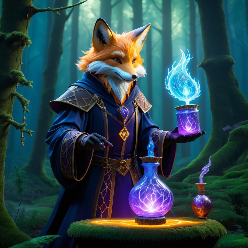 A fantasy scene featuring an anthropomorphic fox mage in a richly detailed blue and gold robe, standing in an enchanted forest. The fox is conjuring magical energy with one hand while pouring a glowing liquid from a small container into a magical pitcher on a moss-covered table. The setting includes mystical glowing effects and forest surroundings.