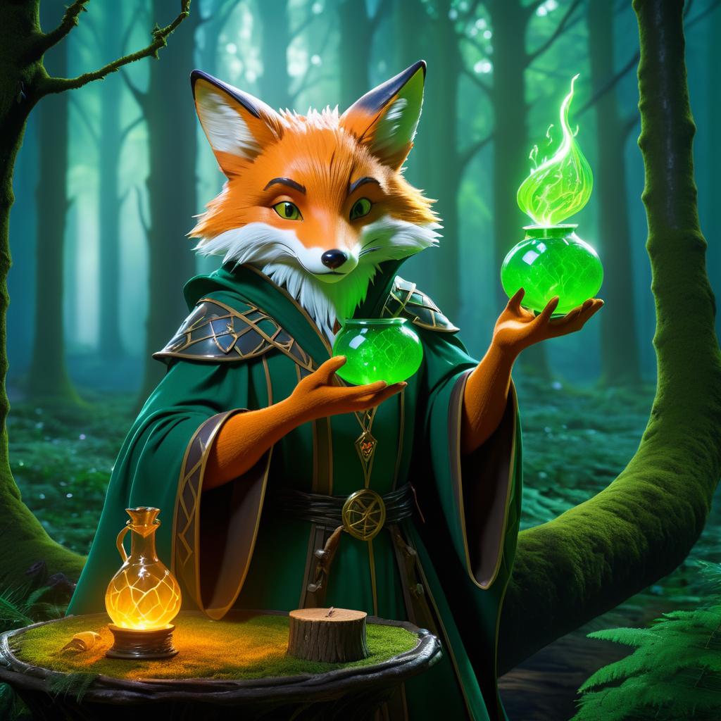 Anthropomorphic fox alchemist brewing a potion in a mystical forest. Styled as cinematic Magic: The Gathering artwork with volumetric lighting by Greg Rutkowski.