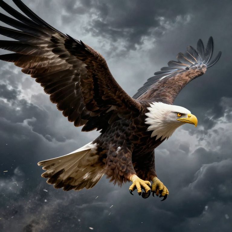 Photograph of a soaring bald eagle with outstretched wings, surrounded by floating, open books against a bright, cloudy sky.
