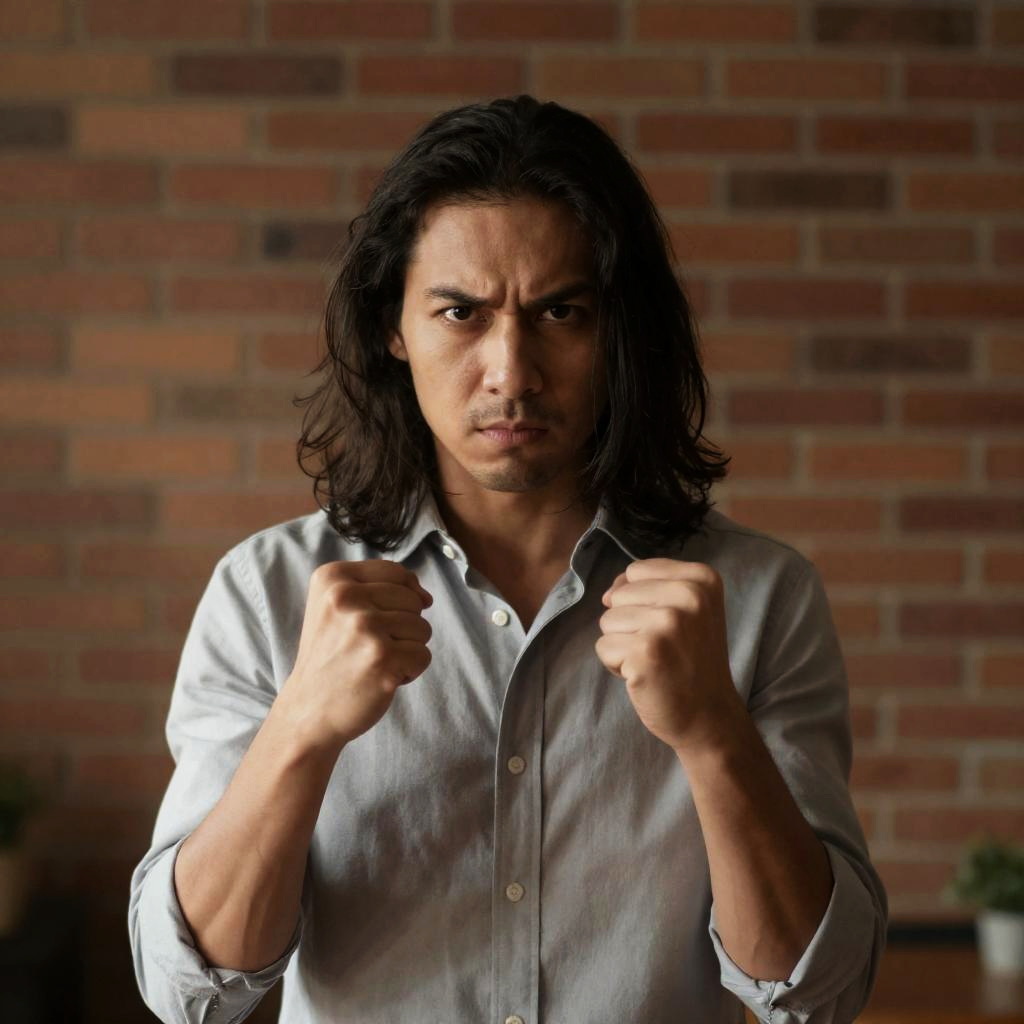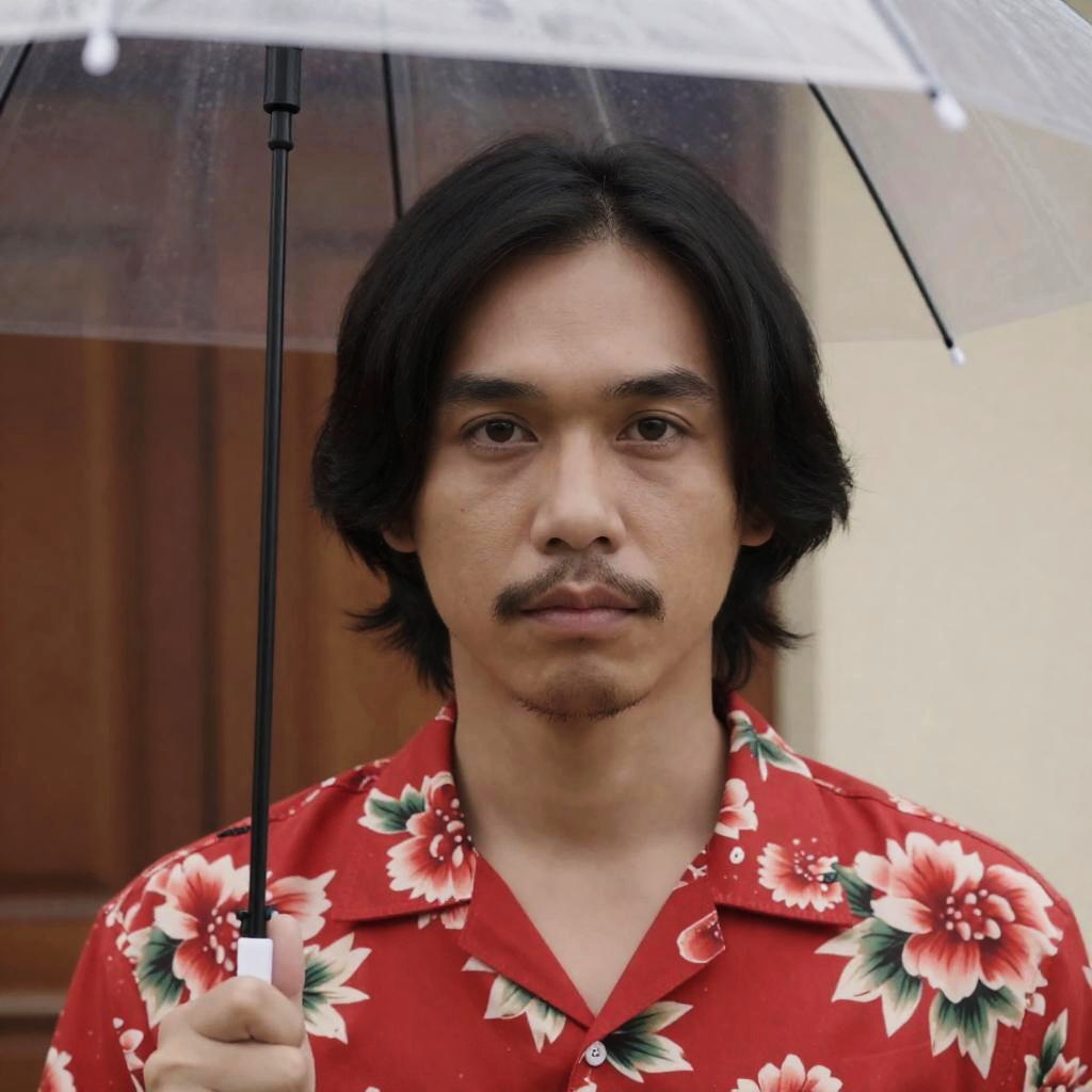 Asian man with medium-length black hair and a thin mustache, wearing a red floral shirt, holding a transparent umbrella overhead. Neutral facial expression, brown eyes. Background includes wooden door and beige wall. Umbrella's top is in the upper frame.